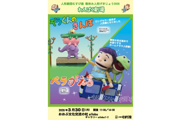 タイトル: 人形劇団むすび座 春休み人形げきじょう2026 わんぱく劇場「ぞうくんのさんぽ/ペラがえる」 | 団体名: 人形劇団むすび座 | 開催日: 2026/03/30~2026/03/30 | 開催場所: おおぶ文化交流の杜 | allobu ギャラリーallobu1・2 | 住所: 愛知県大府市柊山町6丁目150−1 | 詳細 |