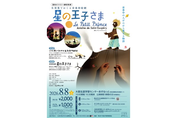 タイトル: 生演奏でおくる音楽影絵劇「星の王子さま」 | 団体名: 影絵劇団かしの樹 | 開催日: 2026/08/08~2026/08/08 | 開催場所: 大里生涯学習センター「あすねっと」文化ホール | 住所: 〒369-0101 埼玉県熊谷市津田1−1 | 詳細 |